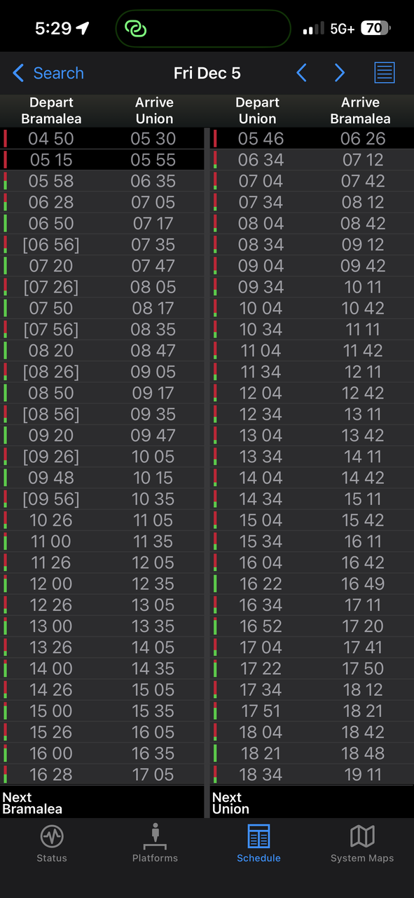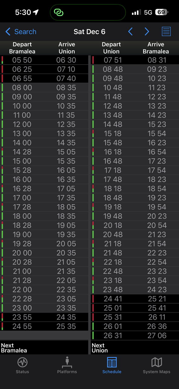 Outside of rush hour, Bramalea receives consistent 30 minute westbound service at 4 & 34 minutes after the hour. First train west 6:34am, last at 30 minutes at 10:34pm. There is also an 11:34pm departure, usually the last of the night. Eastbound trips depart Bramalea at 00 and 24-28 minutes past each hour up until 10:26pm. There is a final departure at 11:26pm arriving at Union after midnight.. Not quite consistent 30 minute service but consistent nonetheless. There is still a counter peak quirk where eastbound service goes to hourly (but you asked about outside rush hour..) In total, rush hour & express service in, there are now 78 daily trips to/from BramaleaI know GO just improved service on the Kitchener so with that in mind.........