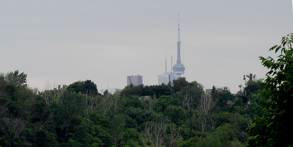 toronto skyline from halfway down thorncliffe access road to e.t.seton park