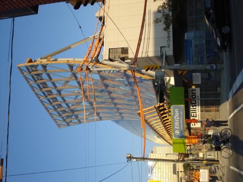 The AGO is North America’s tenth largest museum. Founded in 1900, it first was housed in the Grange, a Georgian mansion built in 1817. Over the decades, the museum has undergone six expansions—the Gehry project being the seventh–giving rise to a sprawling complex with an eclectic aesthetic. For the front elevation, Gehry has designed a new façade, a 600-foot-wide sweep of ribbed glass, which replaces a redbrick version from a 1993 renovation by Barton Myers and Kuwabara Payne McKenna Blumberg Architects (KPMB).